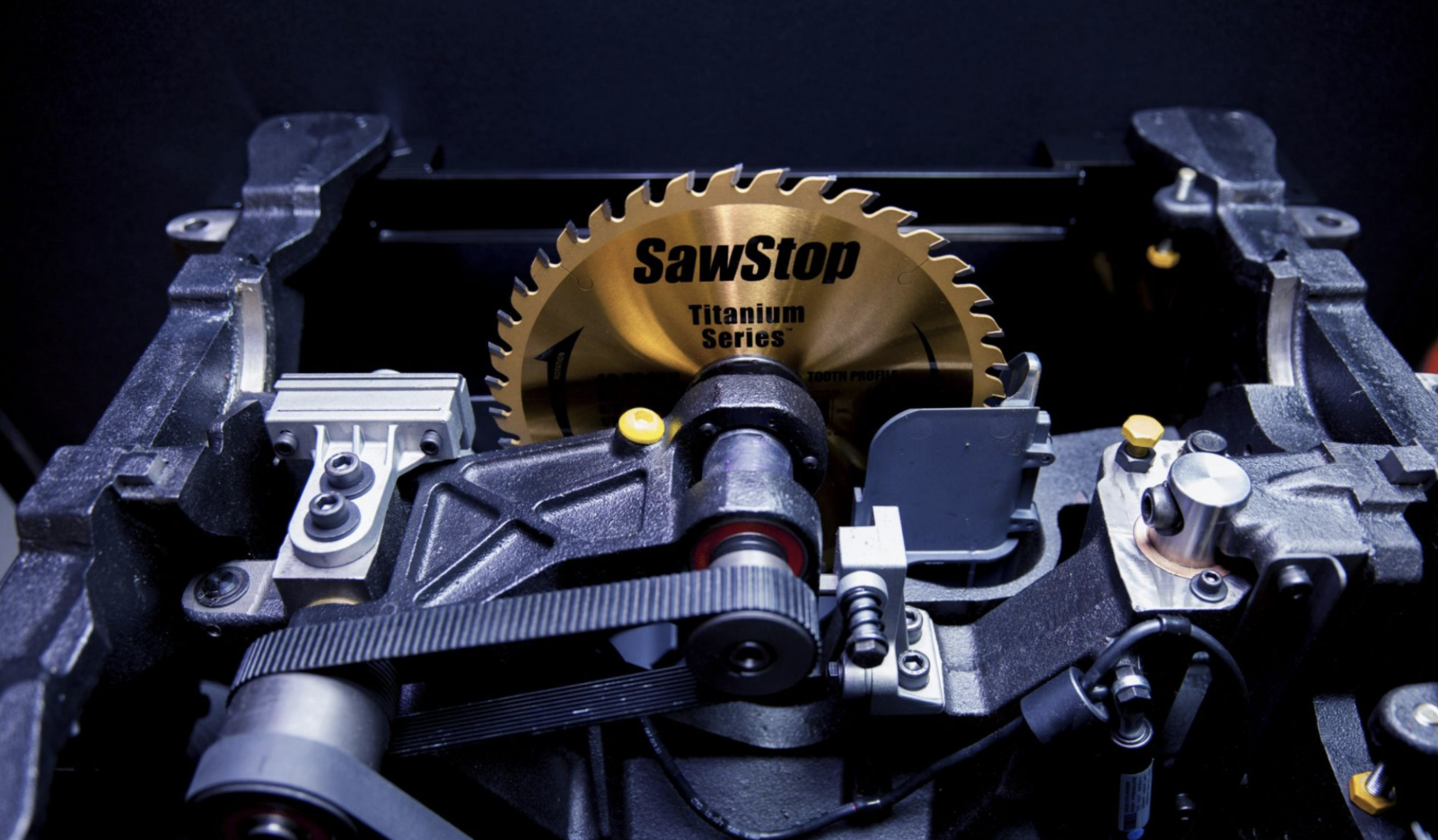 為了停止電鋸,當接觸被檢測到的時候,一個快速反應剎車會停止鋸片,這個剎車包括一個剎車制動桿,使用重載彈簧去推動鋁制剎車片,并會與鋸片的鋸齒相齒合從而停止鋸片轉動。這個彈簧一直被保險絲壓縮著,直到接觸發生。當接觸被檢測到的時候,系統會產生一個強大的電流通過保險絲使之溶化,并釋放彈簧。這個彈簧推動剎車制動桿進入旋轉鋸片的鋸齒,這個鋸齒卡入制動桿并停止,鋸片因此停止旋轉。從臺鋸鋸齒剛接觸皮膚到完全停止刀片轉動并且收縮回去,總共僅需3-5毫秒或1/200秒的時間。 與此同時鋸片的角動量會導致鋸片縮回臺面之下并且關閉電機。